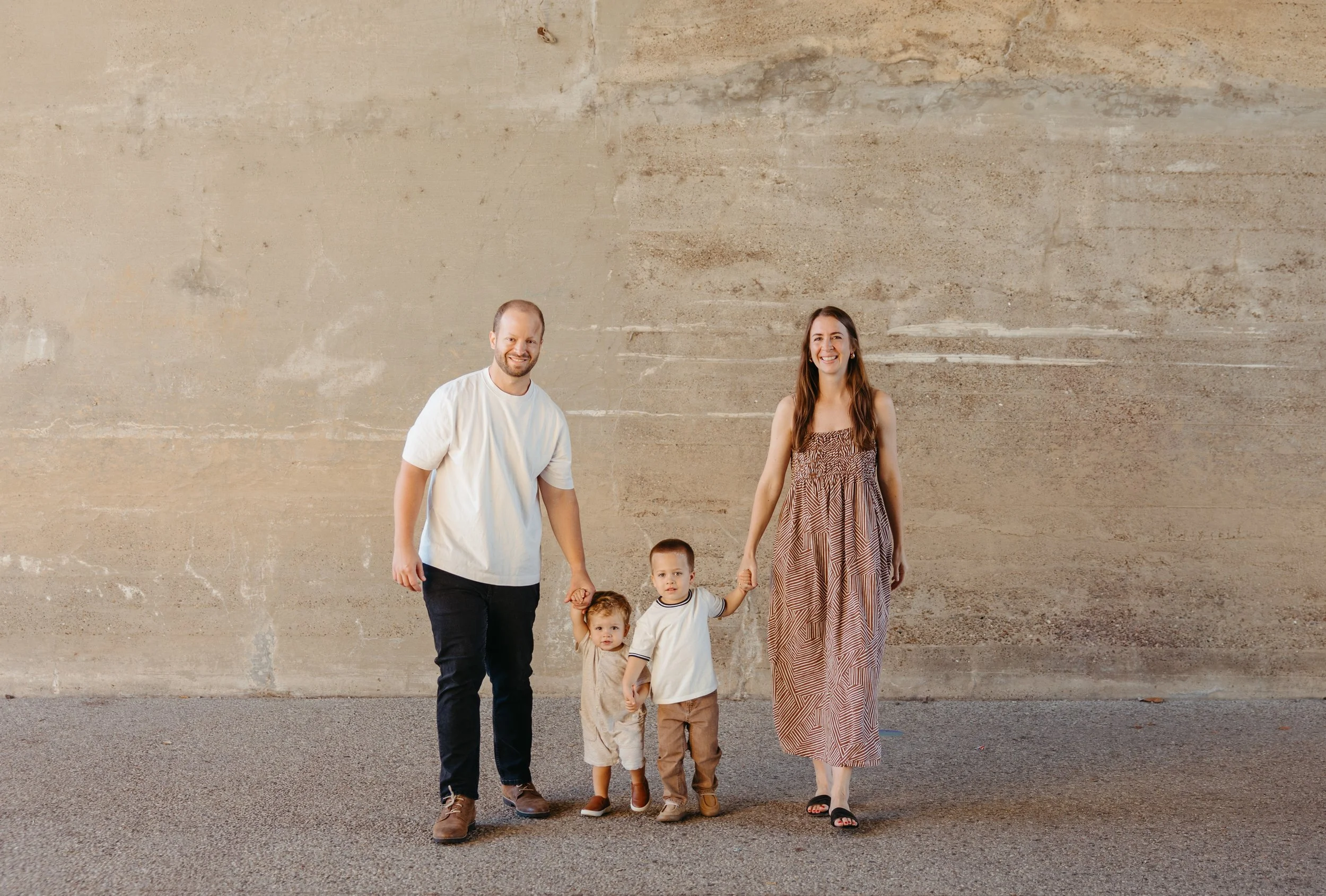 And just a little reminder: family sessions don’t always have to mean grass and golden hour. Downtown, industrial spots can add so much character and personality to your photos, especially if you want something a little different from the typical park backdrop. Sometimes concrete, brick, and city charm tell your story just as perfectly.